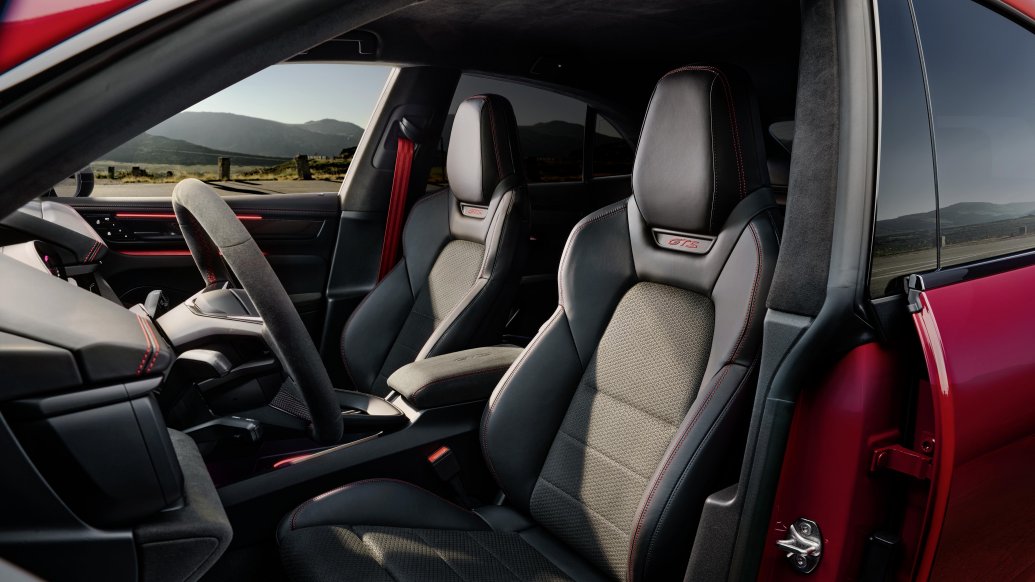 - Interior: tapicería Race-Tex con cuero negro y asientos deportivos adaptativos (18 posiciones); paquete interior GTS con costuras y cinturones a juego.